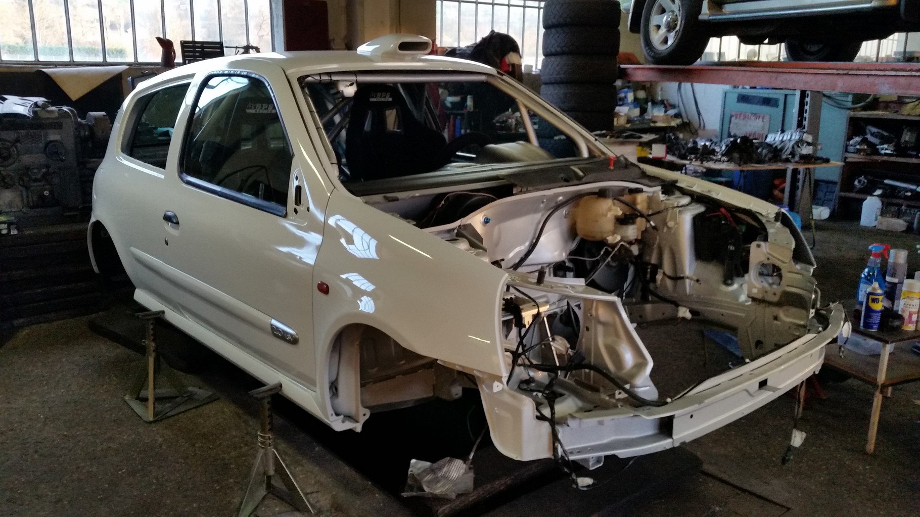 Notre Clio blanche avait terminé la saison 2016 sur une grosse casse mécanique suite à un sur-régime, donc nous en profitons pour tout refaire à neuf. Pour attaquer la saison 2017, le moteur, la boite à vitesses, embrayage, amortisseurs et freins seront entièrement neuf.