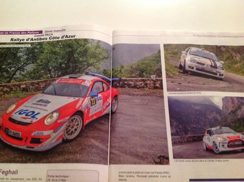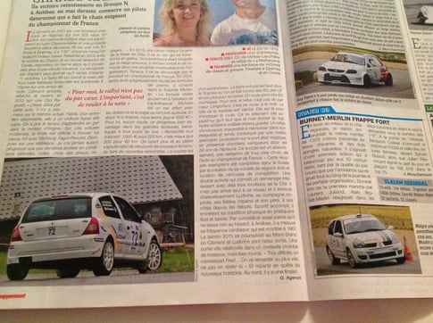 Belle photo de la clio ragnotti R2S Location dans baquet magazine de Juin 2015 lors de la victoire du groupe N en championnat de france des rallyes à Antibes.